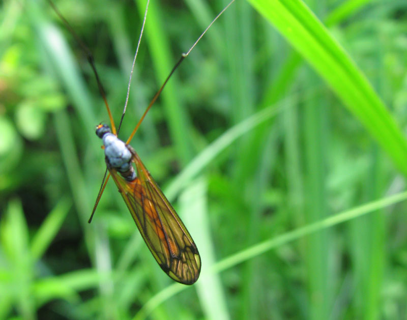 キゴシガガンボ:腹部の中央が広く黄色。頭部と胸部は黒色。脚の腿節は黄色。はねは透明で、縁と脈は黒色。体長21-23ミリ。