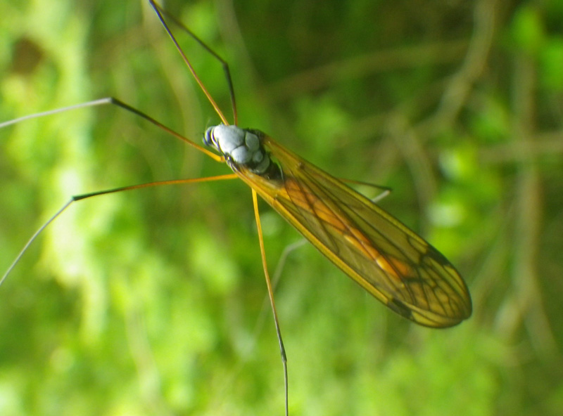 キゴシガガンボ:腹部の中央が広く黄色。頭部と胸部は黒色。脚の腿節は黄色。はねは透明で、縁と脈は黒色。体長21-23ミリ。