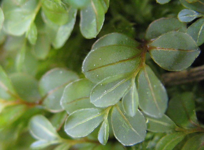 茎は赤みを帯び、葉は卵型に近い。ウチワチョウチンゴケ属。