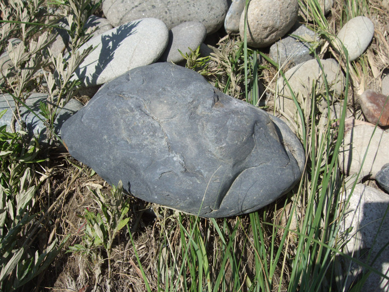 黒っぽい色をしている。火山岩とは異なり、肉眼で確認できるような大きな