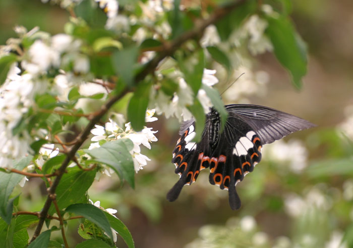このほかキタテハ2、キマダラヒカゲ1、ハチ多数。警戒心の強いモンキアゲハもウツギの香りに酔っているようです。