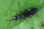 成虫は、体長9ミリぐらい。全身黒色で、翅も黒い。腹部に白色紋がある。翅の縁紋も