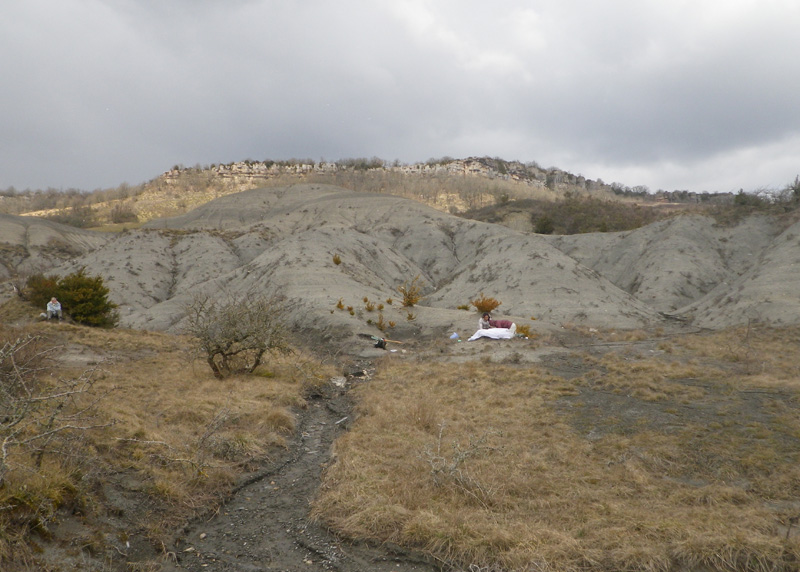 アンモナイト化石は雨が降ったあと流れた小川にたくさん集まっている。母岩には