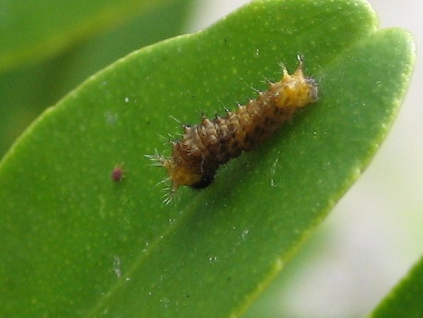 6月6日。観察してきた卵は黒いままですが、気がつかないところにも卵があったようで、かわいい幼虫が生まれていました。