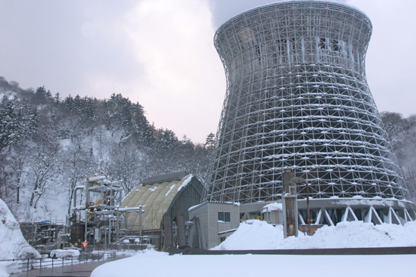 全体像です.地下から高温の温泉水をくみ上げ,その蒸気でタービンをまわして発電します.