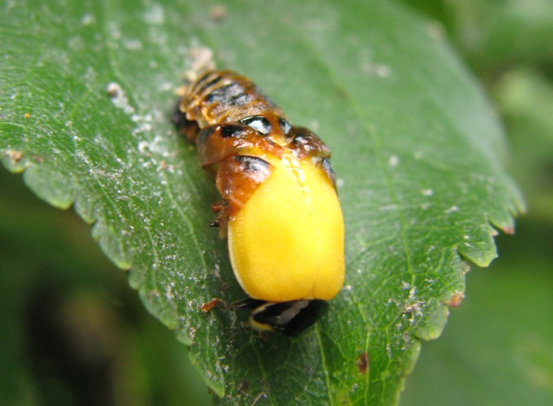 観察していたら、頭から殻を破って羽化しました。黄色い体が美しいですね。