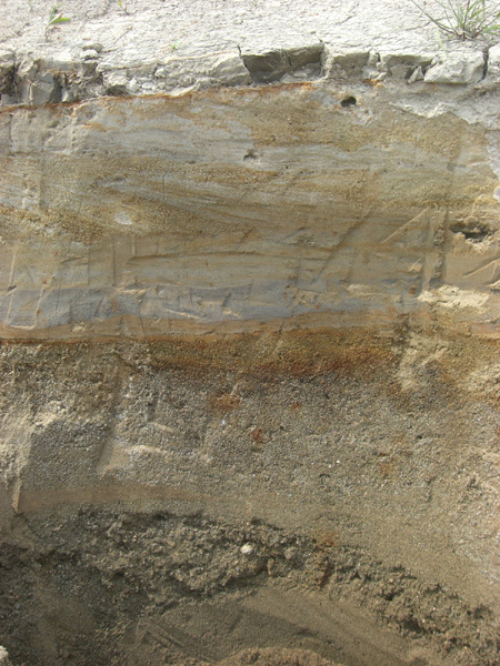 上位の砂層には斜交層理がみられます。傾きから流れが逆流であることがわかります。