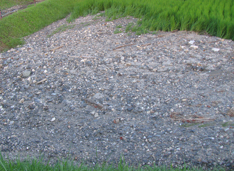 田んぼに流れ込んだ土砂の堆積物