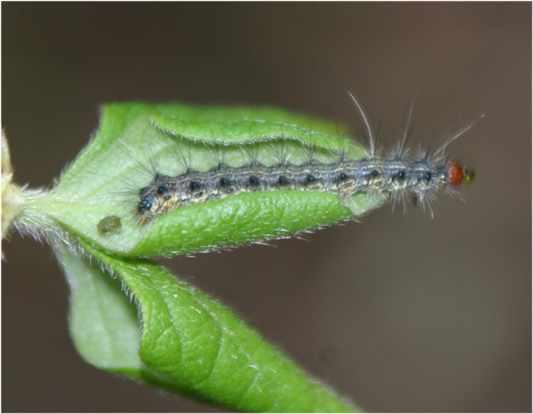 褐色の頭部,気門の部分の青い模様などから,カクモンヒトリという蛾の幼虫だと思われます.