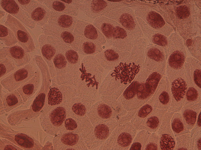 写真中央部に分裂中の細胞が2つあります。左側は中期、右側はまだ前期の段階です。