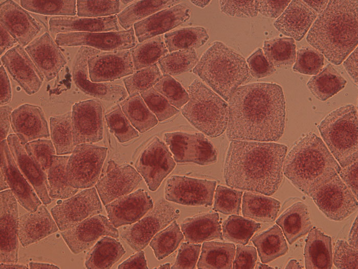 写真中央に細胞分裂の後期に当たる細胞が見えます。染色体が両極に引っ張られているところです。