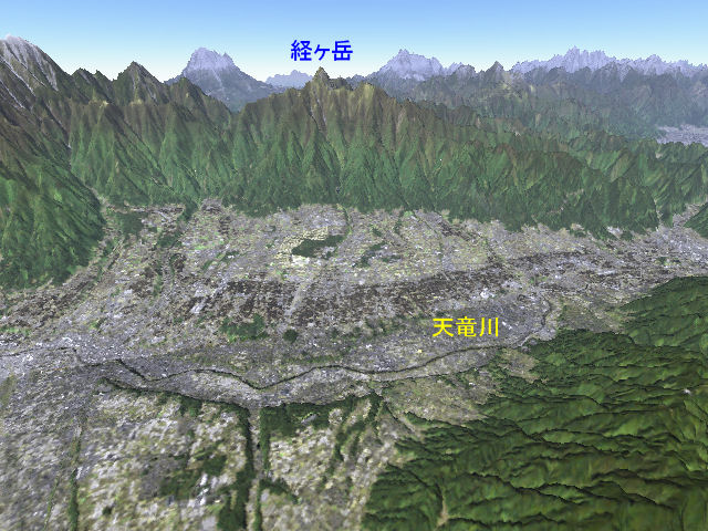 南アルプルの方から、南箕輪小学校のある平地とその奥の木曽山地の地形を表現した図です.
