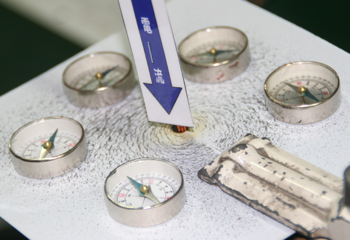 砂鉄と方位磁石で、磁力線の形と向きを調べます。