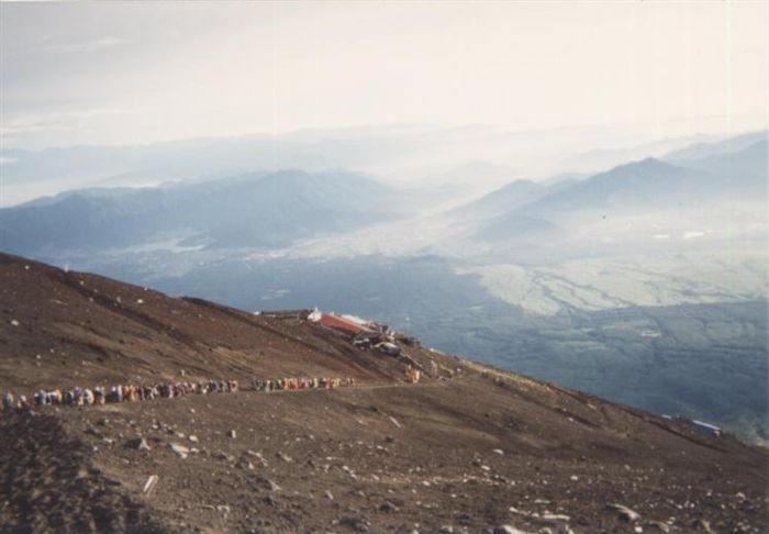 2003年8月8日、下山中、8合目付近で撮影しました。下山道を歩く人の列が続きます。