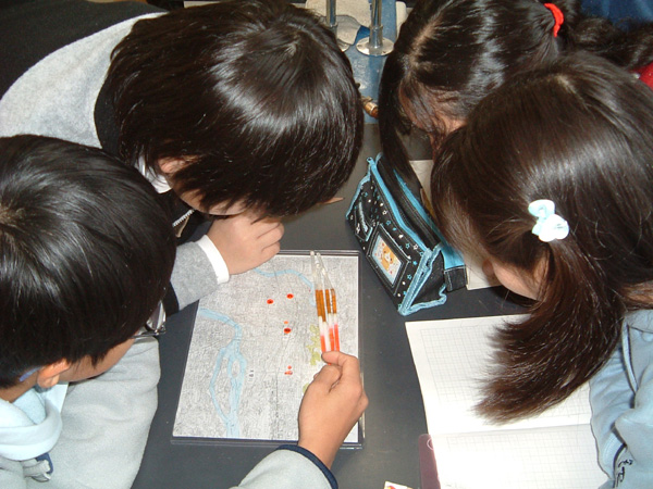 ボーリング調査地点で得られた情報から,小学校の地下構造を推理する子どもたち.