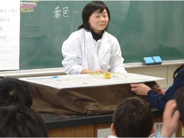 大きなコンテナに地層の重なりを寒天で再現したモデルです.
