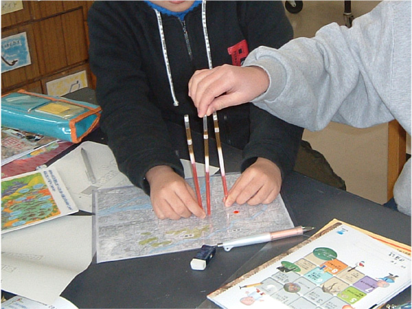 小学校の地下でそれぞれの地層の厚さを推理した結果と,実際にストローに見られる