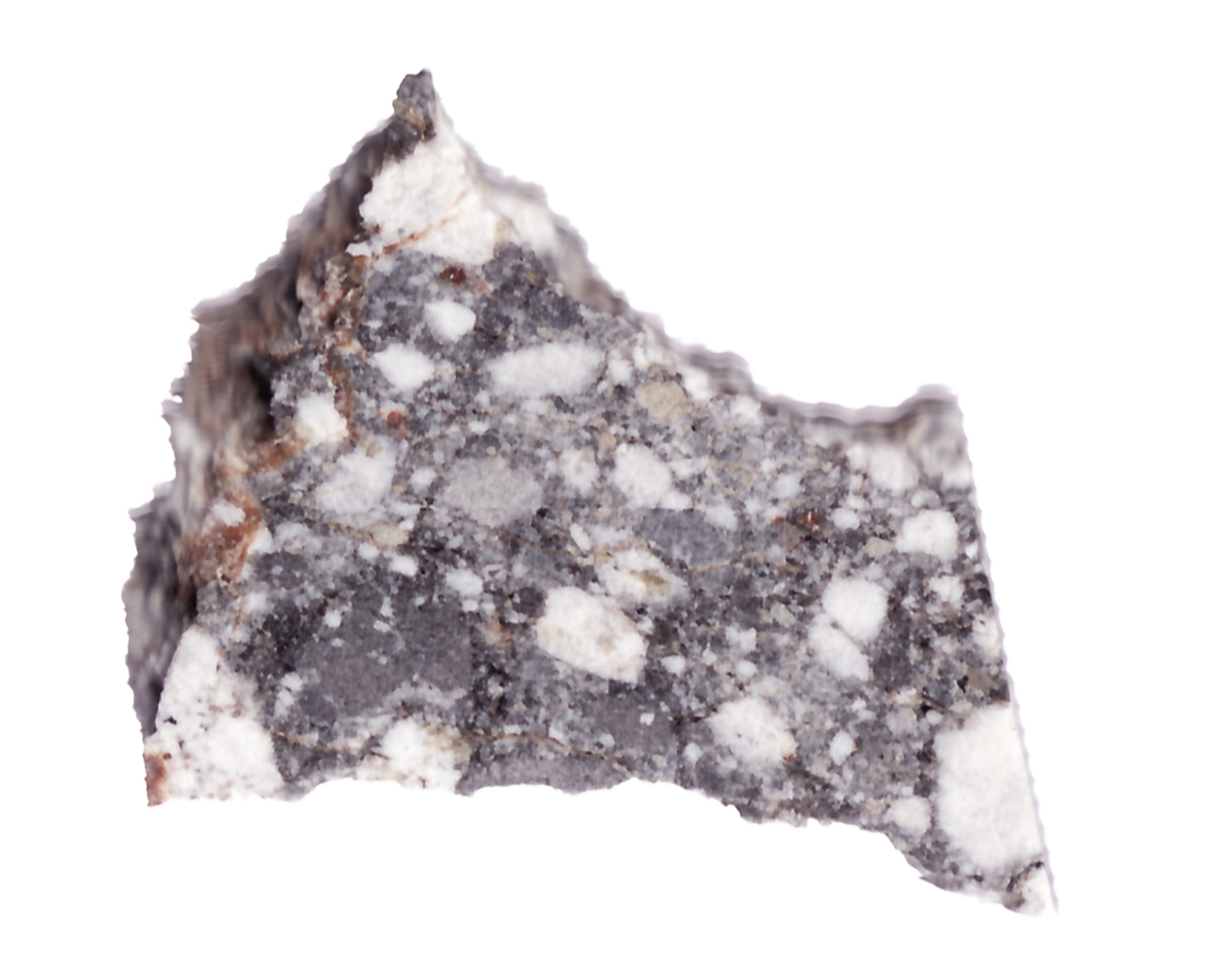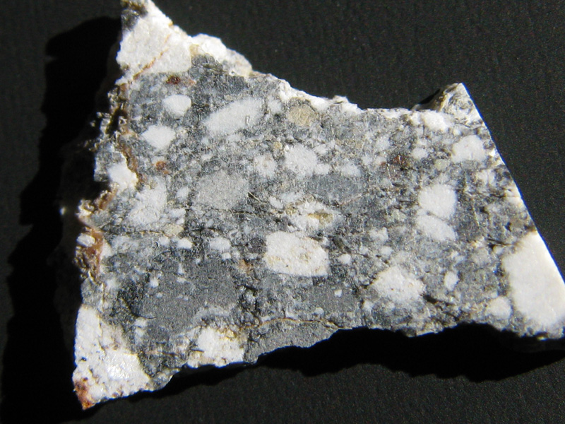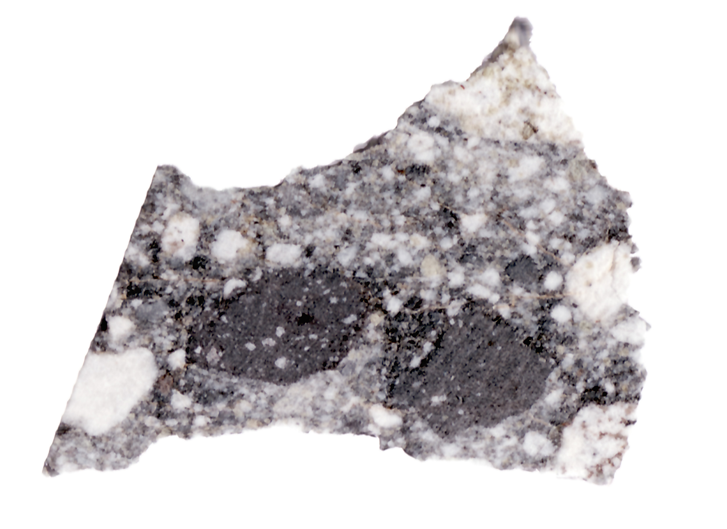 白色の岩片は、斑レイ岩(ガブロ)で、Caに富んだ斜長石、輝石(ピジョナイト)などの