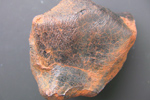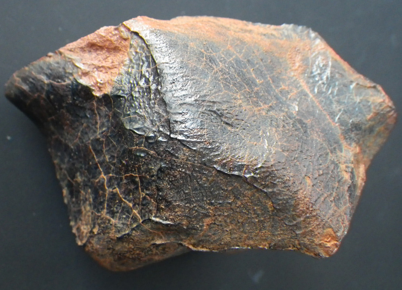 光沢のある黒色の溶融表皮がみられる。落下後に酸化して赤みを帯びた色がついている。