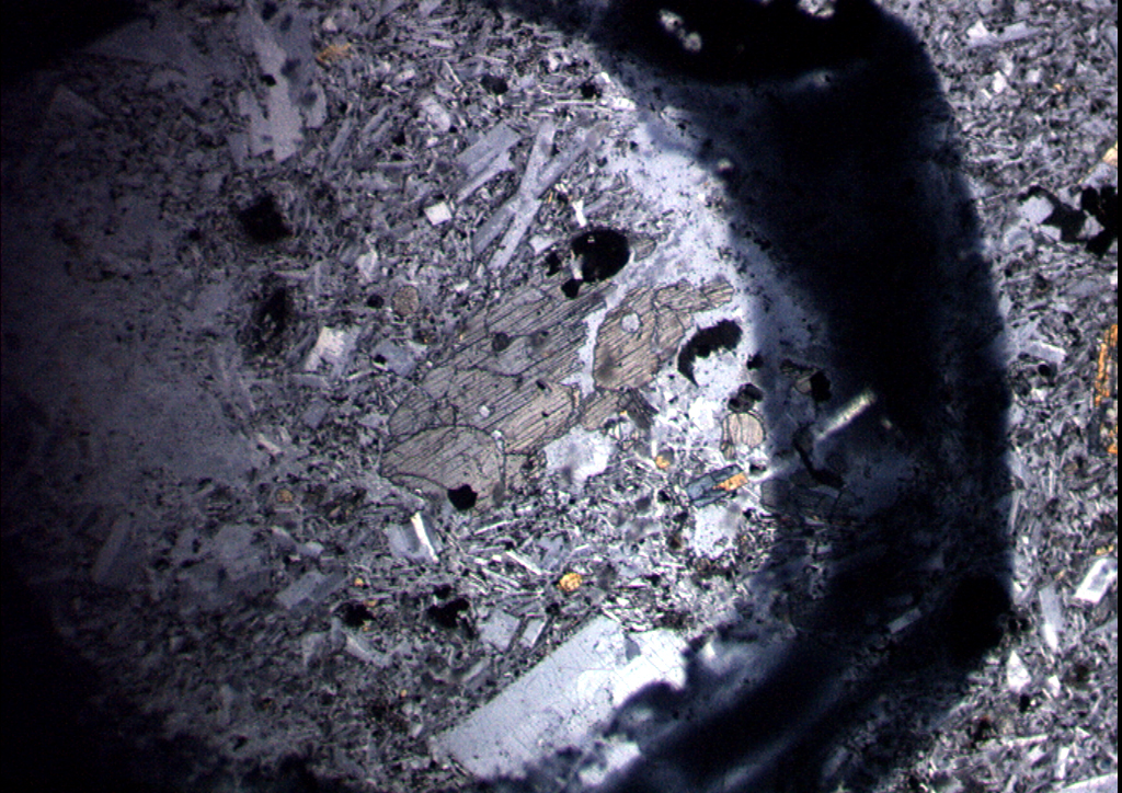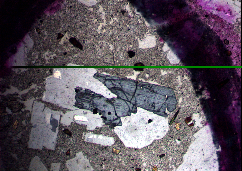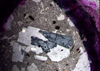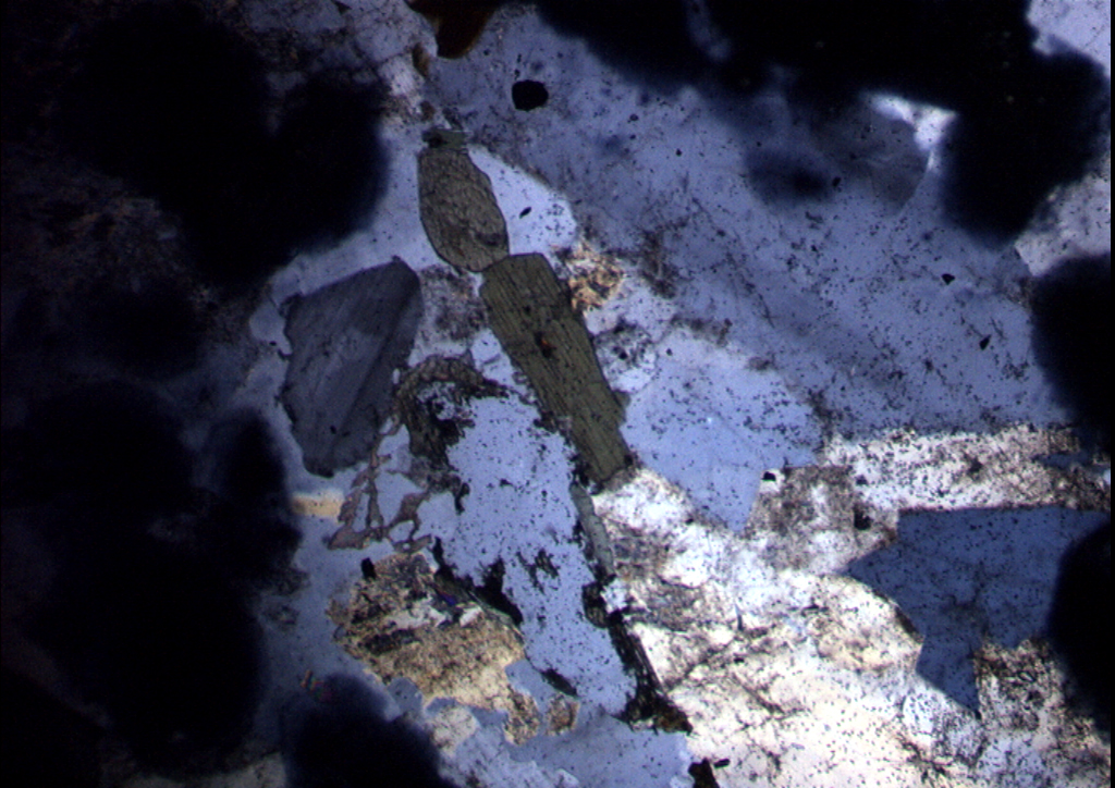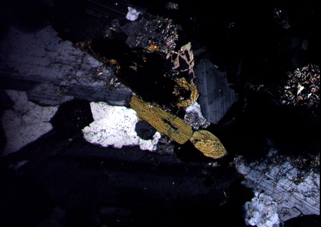| 淡青色〜淡赤色で形は柱状。 二方向にへき開あり。 多色性があり、ほぼ直消光。 結晶系は斜方晶系。 |