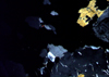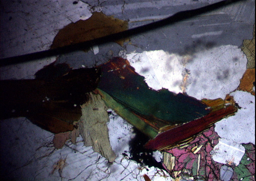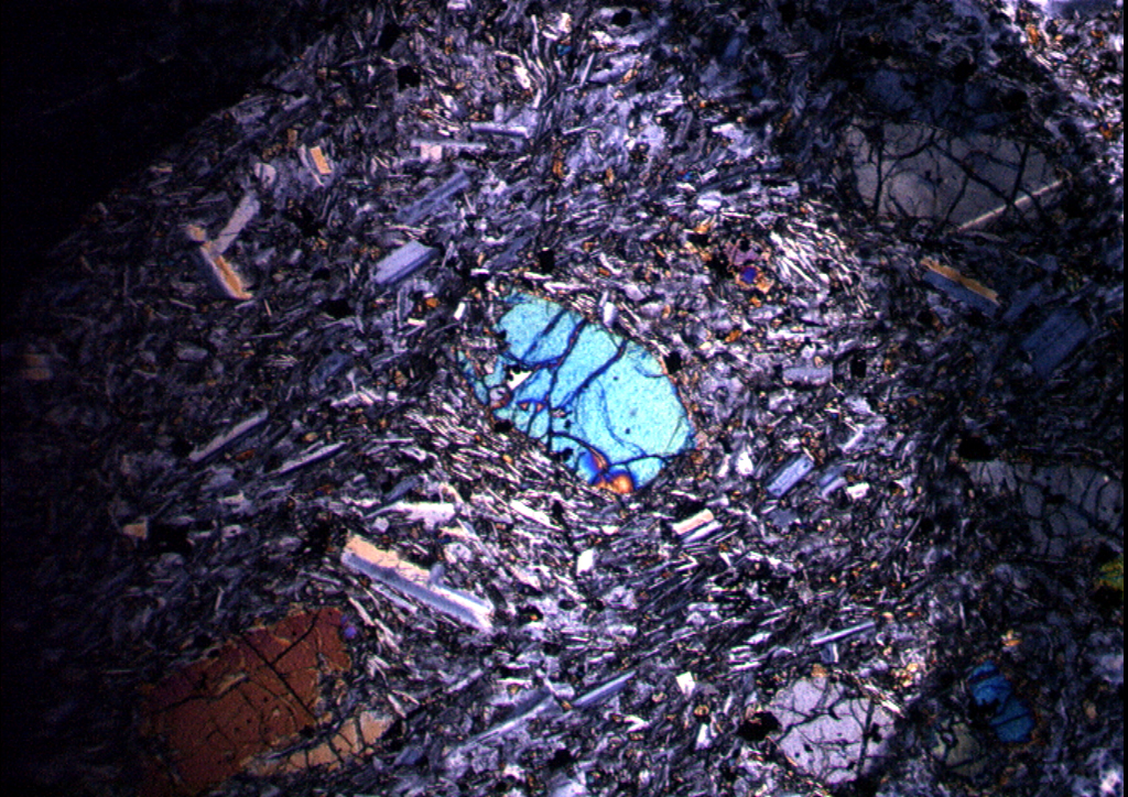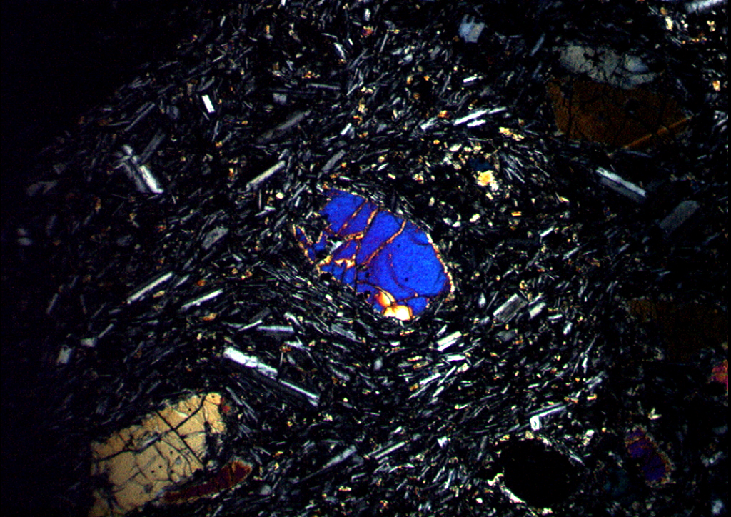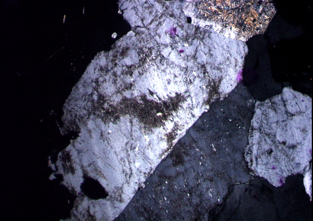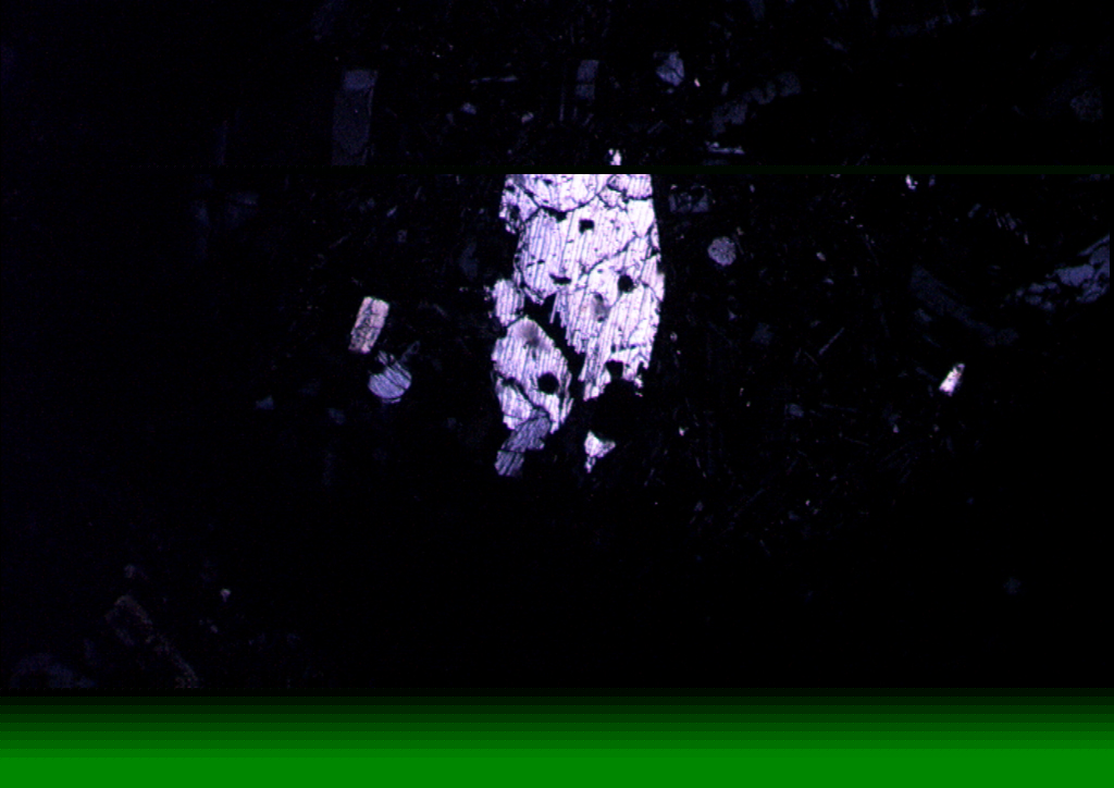 | 淡青色〜淡赤色で形は柱状。 二方向にへき開あり。 多色性があり、ほぼ直消光。 結晶系は斜方晶系。 |