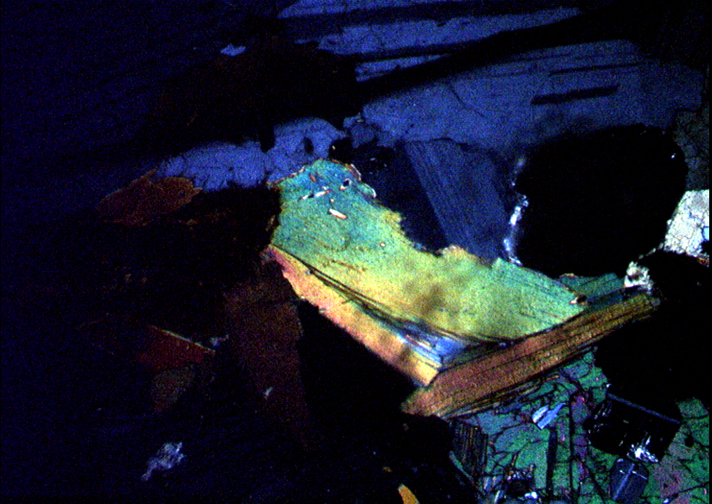 | ほとんど無色の短柱状で、二方向にへき開あり。 消光角40°前後。結晶系は単車晶系。 多色性ほとんど無し。 |