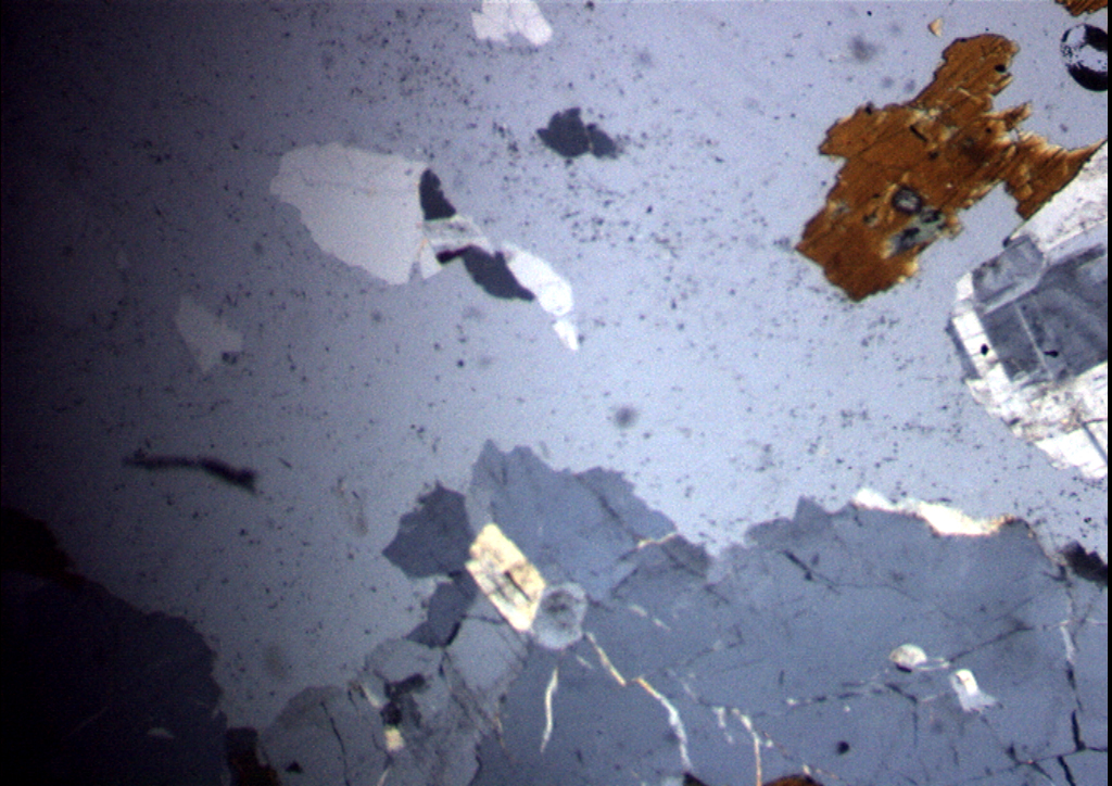 | 無色鉱物で双晶も無し。 主に波状消光を示す。 結晶系は三方又は六方晶系。 |
