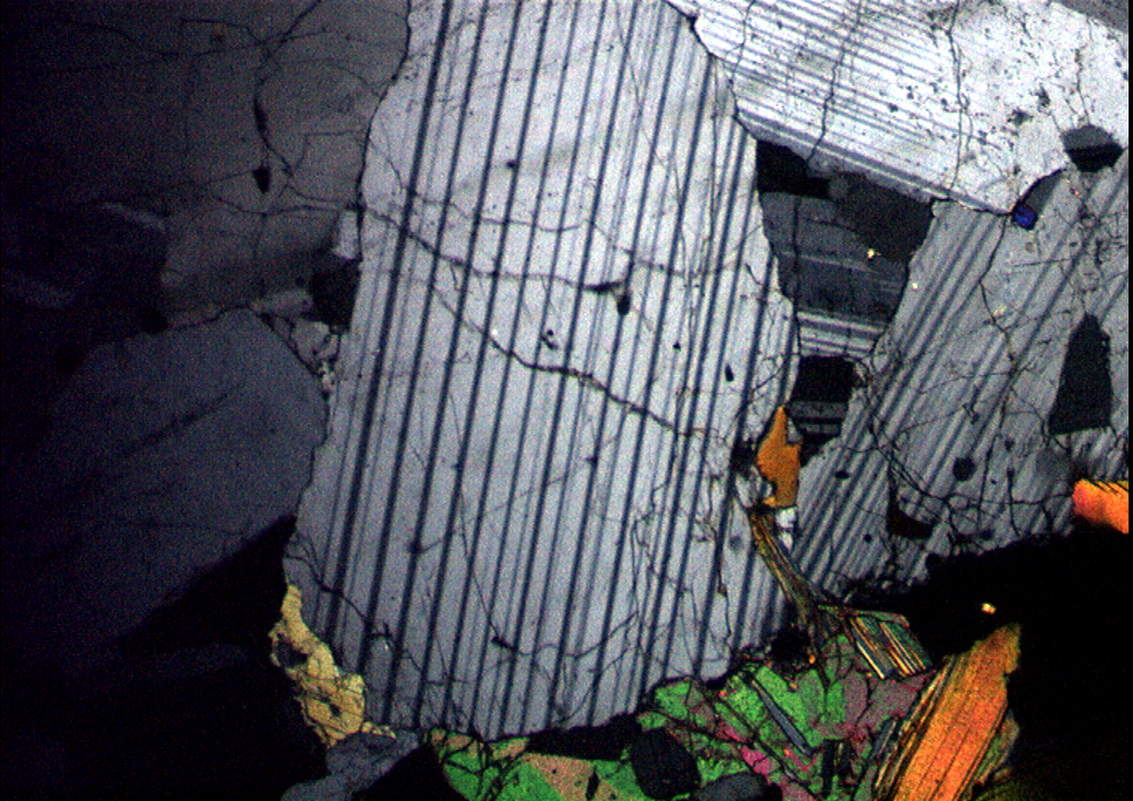 | 無色鉱物で細かい短冊状のアルバイト式双晶が確認できる。 長柱〜短桂状をしている。 結晶系は三斜晶系。 |