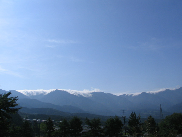 長野県木曽郡山口村で撮影.南の山並みの谷からあふれだした霧.