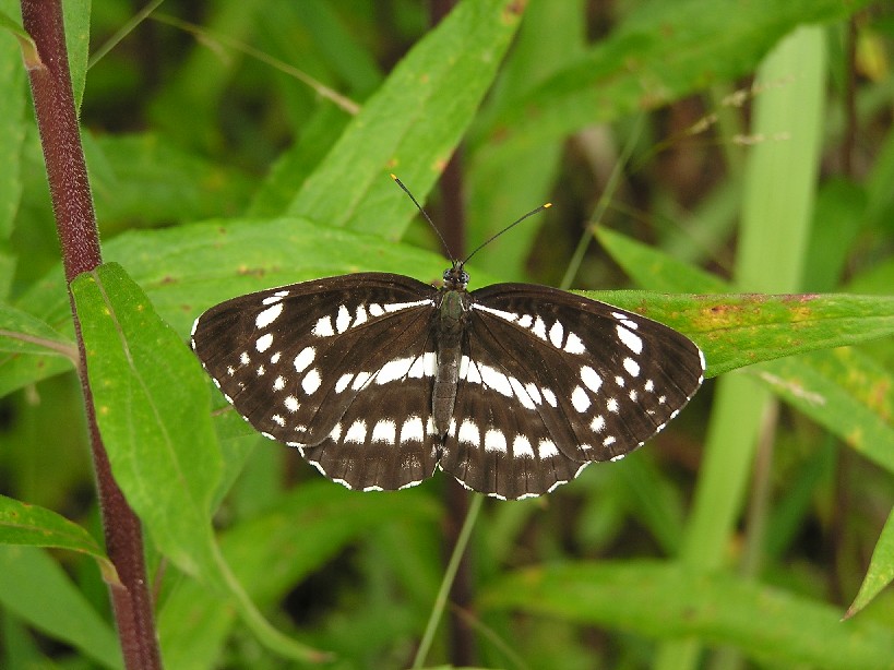 2007年5月30日、緑原の早朝、草の上に蝶が静かに止まっている。コミスジと見分けるのが難しい