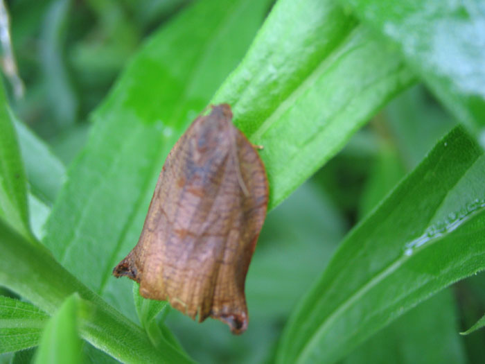 体長1.2センチぐらい。やや大型のハマキ。はねの先端に斑点がひとつ。