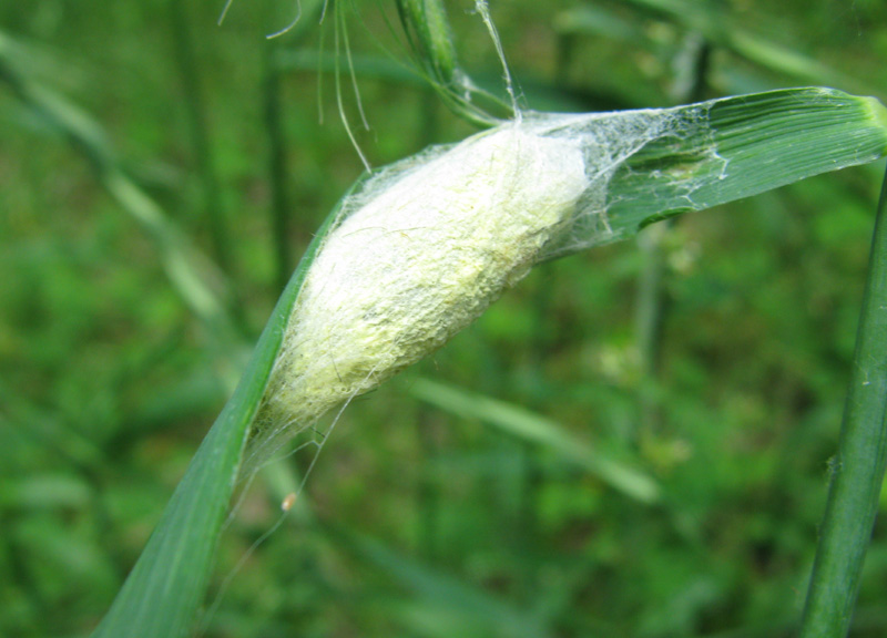 イネ科の草の葉に繭がありました。羽化してきたのはオビカレハでした。