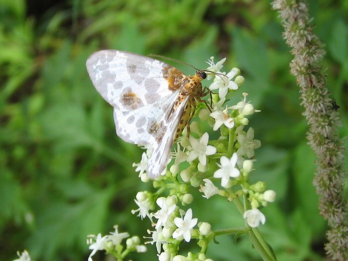 オトコエシの花で蜜を吸うか、花粉を食べるかしている様子のユウマダラエダシャク。