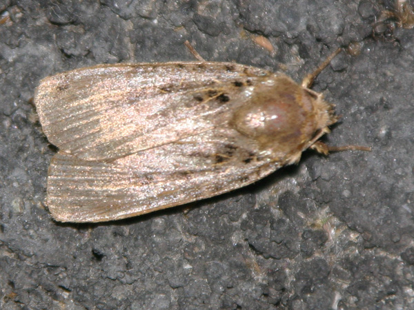 カラスヨトウ系の色合いですが,黒い斑点があります.体長1センチぐらい.