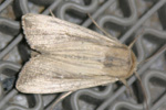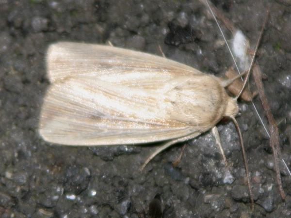 クサシロキヨトウ:開張35-40mm. 前翅は淡灰褐色, 翅脈間に暗色紬条を密布. 翅底から中室下縁に沿う暗色条があり,