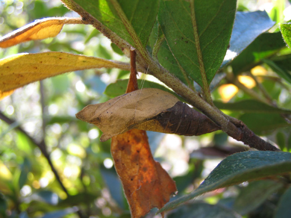 2005年11月21日,岐阜大学「チョウの楽園」のツツジの枝で冬を迎えるアゲハのサナギ.