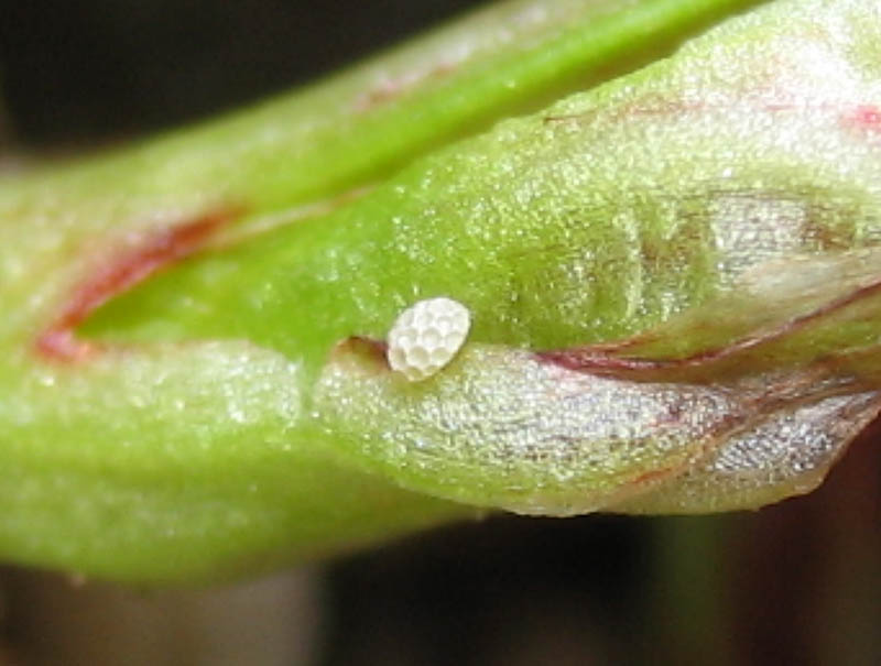 葉にとまって根元の方までつたっていって、根元近くの葉に産卵していました。