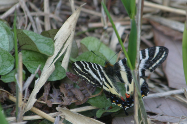 カンアオイのそばに止まったギフチョウのメス.