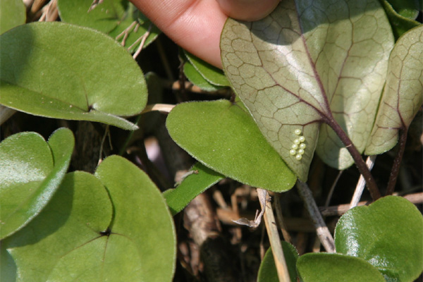 カンアオイの葉のうらに産みつけられたたまご.