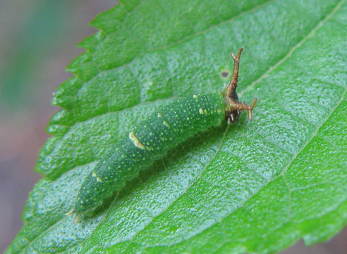 食草は、エノキ、エゾエノキ.幼虫は緑色で、頭部に長い角状突起がある。