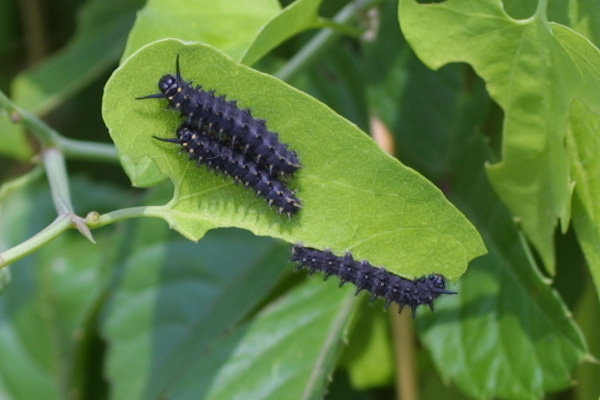 幼虫の色は黒く,頭部に角のようなものがでています.黄色い模様もみられます.
