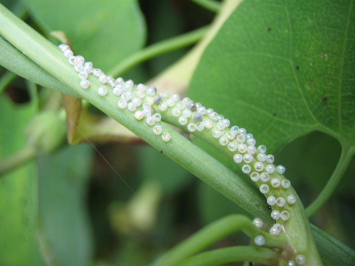 楽園のウマノスズクサに孵化間もないホソオチョウの幼虫がいました。