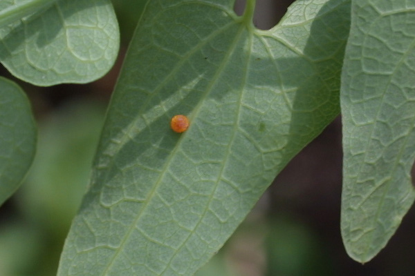 メスが産卵していたので,飛び去ったあと葉の裏をめくったらたまごがついていました.