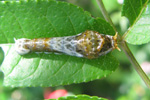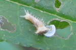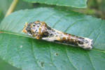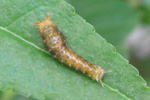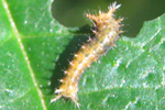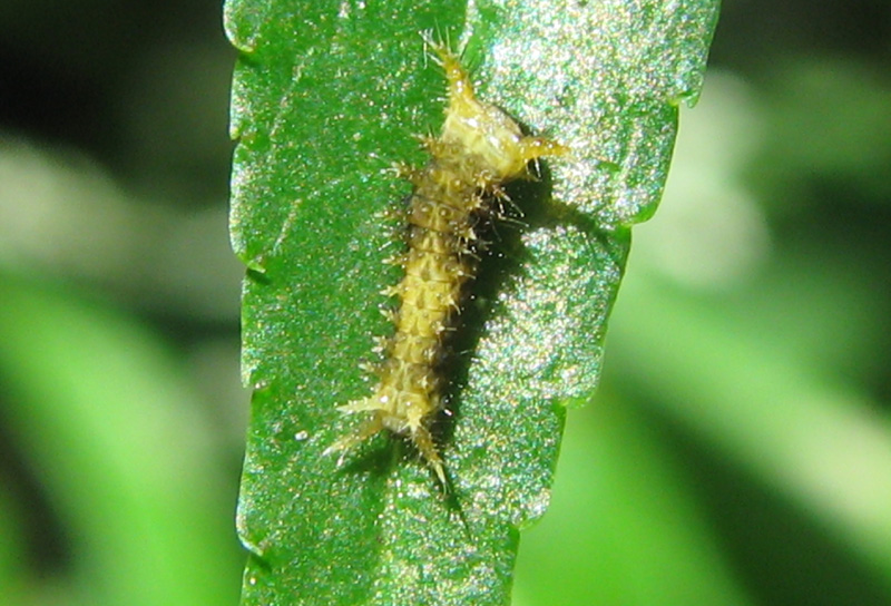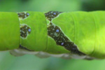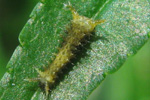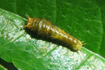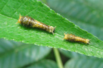 若い幼虫では、腹部の末端の突起が長いのと、表面が黄色っぽくて、