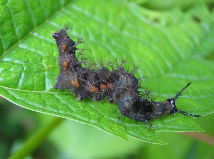 チョウの幼虫のようです。コアカソの葉にいました。クジャクチョウか?サカハチチョウか?
