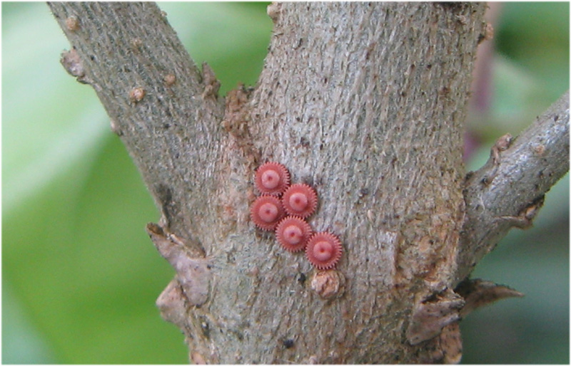 2008年6月24日,岐阜市北部.イボタノキに産みつけられたたまご.
