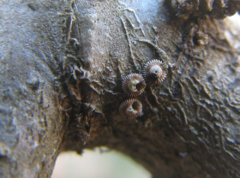 枝の又の部分に卵が3個。いずれも孔が開いています。