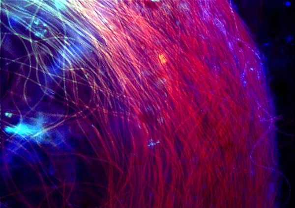 蛍光顕微鏡で自家蛍光を示す。シアノバクテリアに属する細菌。