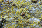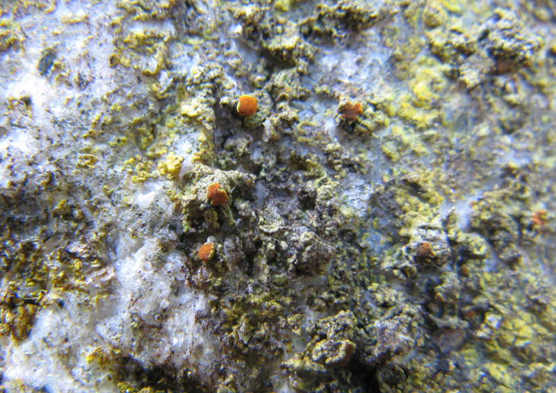 オレンジ色の子器をつけている。地衣体は燐片状にみえる。鳥居に生えていた。