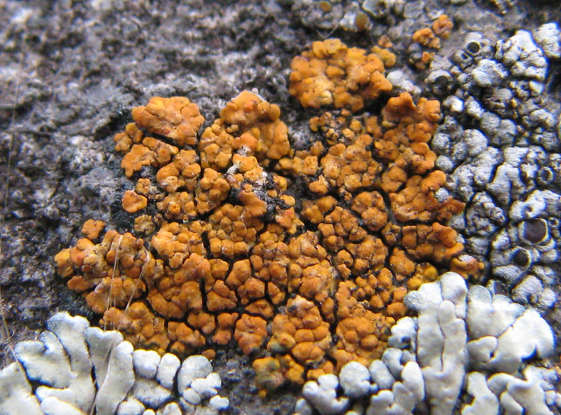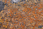 石の表面に生えていた。地衣体は1cm程度で、オレンジ色。ダイダイゴケ科。